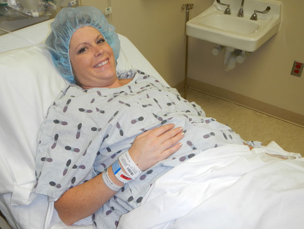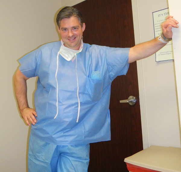 Mom and I got up bright and early and left the house at 6:28AM to head over to Reston Hospital only 3 min. away. When we got there things seemed to happen very quickly as your mom and I were taken to a room where they prepped her for surgery. I put on hospital scrubs while she changed into a gown. She had 5 different nurses and doctors coming in and out of the room asking questions, telling us what we could expect and recording things in her file.